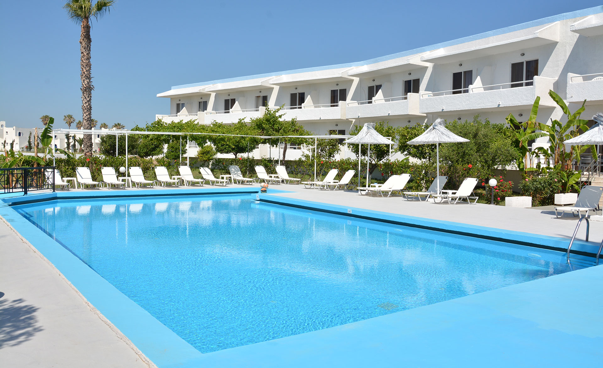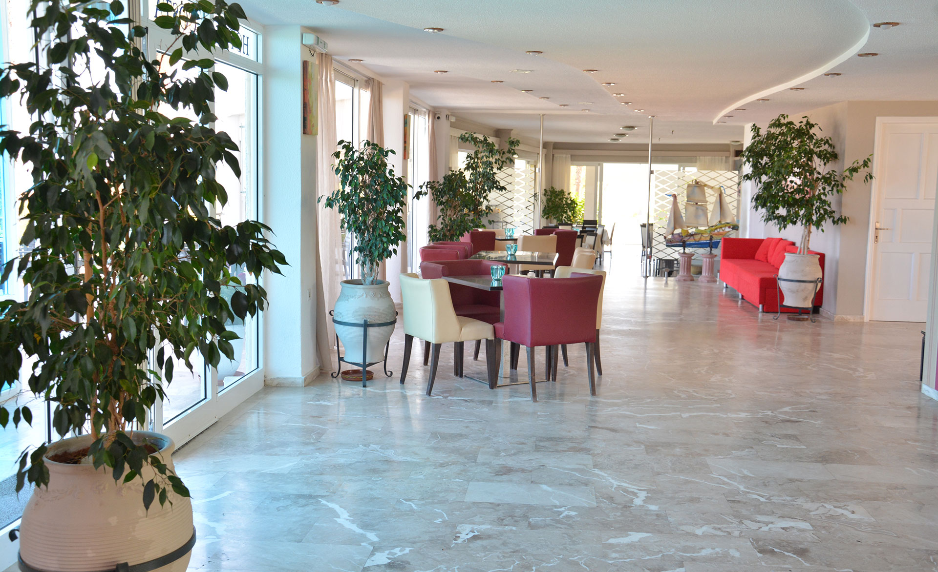 Costa Angela Seaside Resort is ideally situated in Lambi, one of the most attractive regions of the island. It is only 4 km from the center of Kos town and 22 km from the airport. A bus-stop with frequent service either to the center of Kos town or to Tigaki, is in front of the hotel entrance.The hotel is in front of an amazing beach with an eminent view to the clear blue waters of the Aegean Sea, the island of Pserimos and the coasts of minor Asia. It is surrounded by a marvelous garden with a lot of flowers, with palm and banana trees.In the entrance hall there is the 24-hours Reception desk, the lobby, the TV-corner with satellite programs, the library, and the Internet-corner.