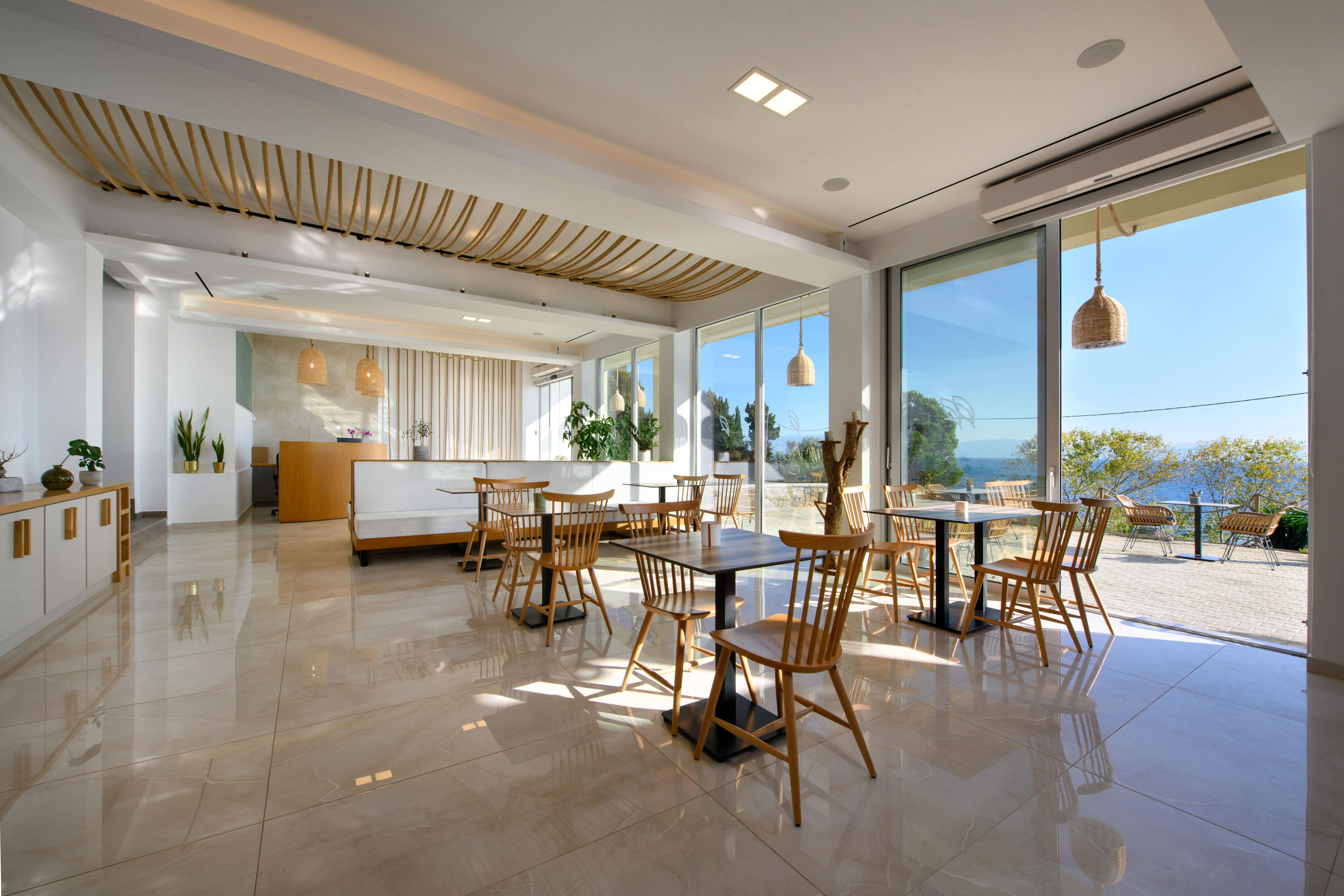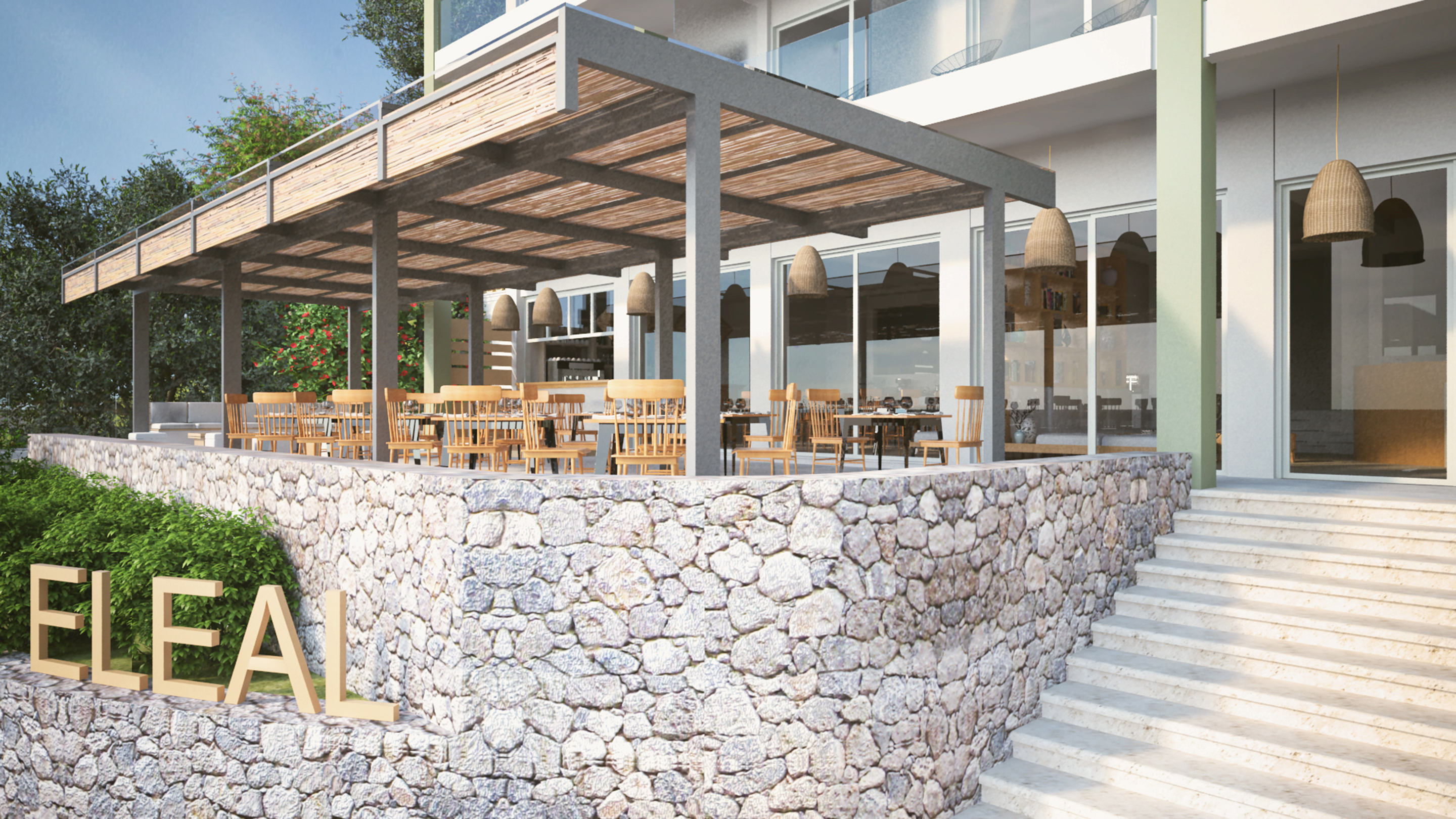ELEALS hotel is a brand-new luxury hotel on the magnificent island of Corfu. Situated by a fabulous private beach and surrounded by numerous olive trees, Eleals is a sanctuary of tranquility and serenity, offering guests ultimate comfort and high-quality services. The hotel is a fine blend of modern and traditional design with minimalist decoration and a unique sense of elegance. Our staff is committed to catering to your needs and make your holidays a truly unforgettable experience. Unwind by the sea, enjoy spectacular sunrise views and indulge in comfort and luxury at ELEALS hotel!Eleals Roof Garden Located at the top of the hotel, ELEALS roof garden invites us all to let the mesmerizing view carry us away and enjoy its relaxing atmosphere and wonderful music. You have the opportunity to savour a wide range of delicious snacks, drink a cup of coffee or tea and lie in the beautiful sunbeds available for our guests. There is no better place to be if you want to unwind and recharge your batteries during your holidays. Eleals Bar Sophisticated and modern, ELEALS Hotel Bar has a unique charm and a marvellous atmosphere that will definitely seduce you! Our service and cocktails are top of the line and our signature drinks are simply outstanding. The bar is open all day long, so don't miss the chance to have a refreshing summer cocktail or a glass of wine while enjoying the gorgeous view and the beautiful music. Eleals Restaurant Indulge in a culinary experience unlike any other at ELEALS Hotel Restaurant! You can taste various mouthwatering snacks, salads and drinks from early in the morning till 7 o'clock in the evening and then enjoy a fine dinner with wonderful Greek and international dishes. Our varied menu offers a selection of meat and fish dishes made with high-quality ingredients and delicious local products that will certainly excite your palate!