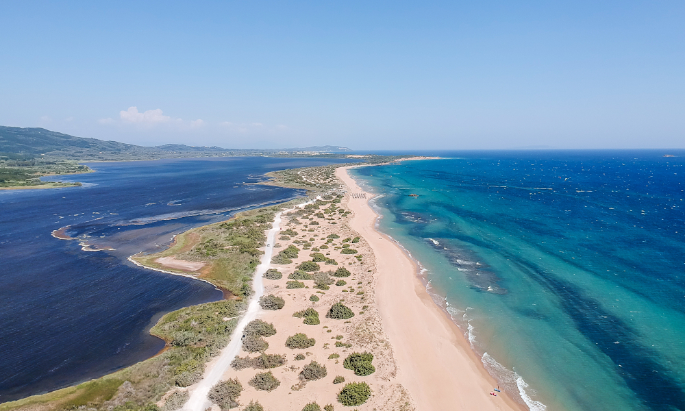Трикілометровий піщаний пляж з дюнами, кедровими гаями і солоним озером, де можна побачити фламінго, чапель і навіть черепах.