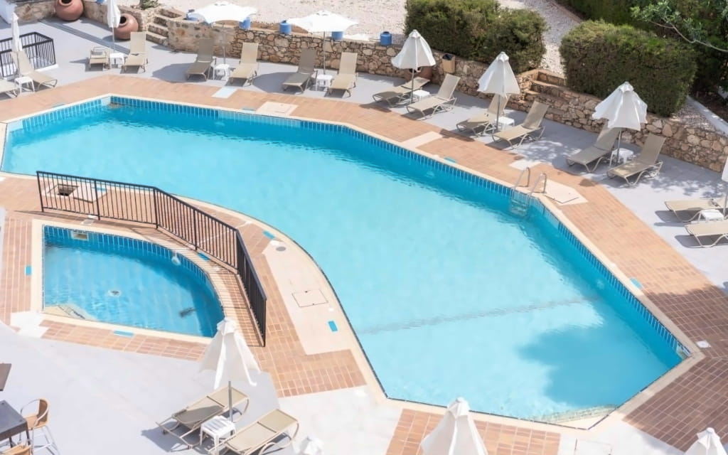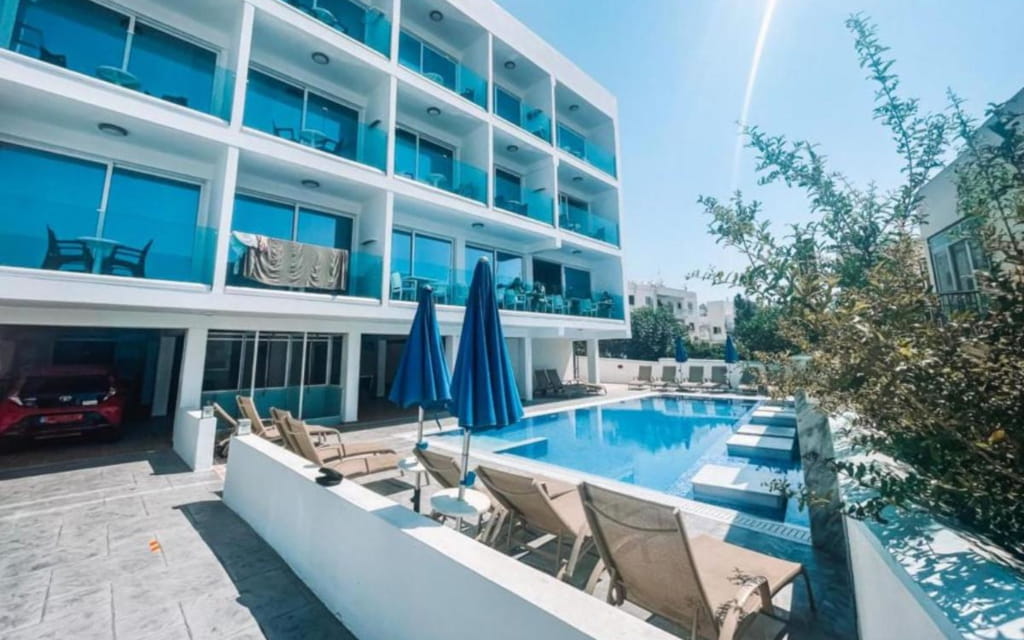 Фішка: гармонійний зелений куточок над центром Ая-Напи — тиха вуличка, охайна територія, басейн у внутрішньому дворику і ідилія. І водночас поряд одразу кілька пляжів: кам’янистий — близько 400 м, піщаний — десь 800 м, а до легендарного Ніссі — орієнтовно 1,5 км. |