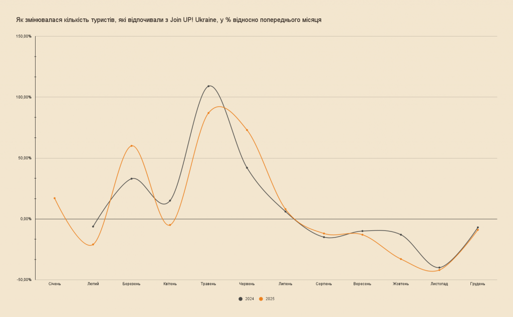 Дані наведені згідно з внутрішньою статистикою Join UP! за 2025, 2024 та 2022 рік. Для обчислень ми взяли до уваги кількість туристів, які відпочили упродовж року, а також туристів, які забронювали подорож упродовж року (усього, за місяцями, за дестинаціями, за типом туру).