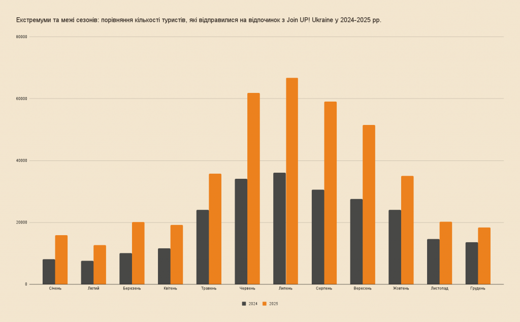Упродовж 2025 з Join UP! відпочили понад 415 тисяч туристів — це приблизно на 65% більше, ніж у 2024, та майже у 2,7 раза більше, ніж у перший рік повномасштабного вторгнення.* Люди не просто шукають трохи більше світла й тепла, а рішуче повертають собі право на повноцінний відпочинок.
