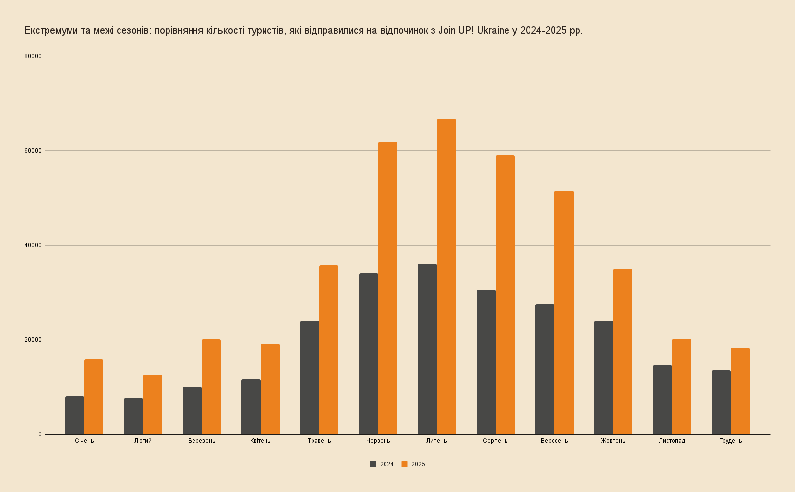 Дані наведені згідно з внутрішньою статистикою Join UP! за 2025, 2024 та 2022 рік. Для обчислень ми взяли до уваги кількість туристів, які відпочили упродовж року, а також туристів, які забронювали подорож упродовж року (усього, за місяцями, за дестинаціями, за типом туру).